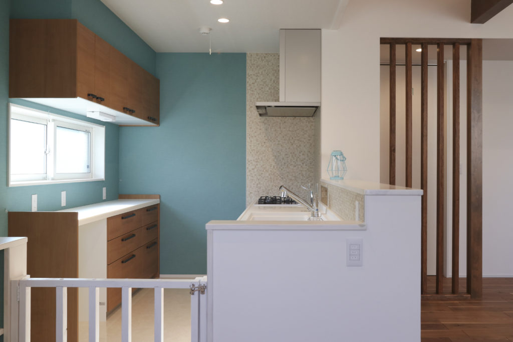 IKEAの小物も一緒に見に行き、家事と収納、動線も確認していきました。 子育て家族にとっては奥様のいる キッチンから家族の動きがみえることが重要ポイントでしたが、子供の安全も大切で 階段やキッチンに出入りできないようにするベビーゲートも設置しています。
