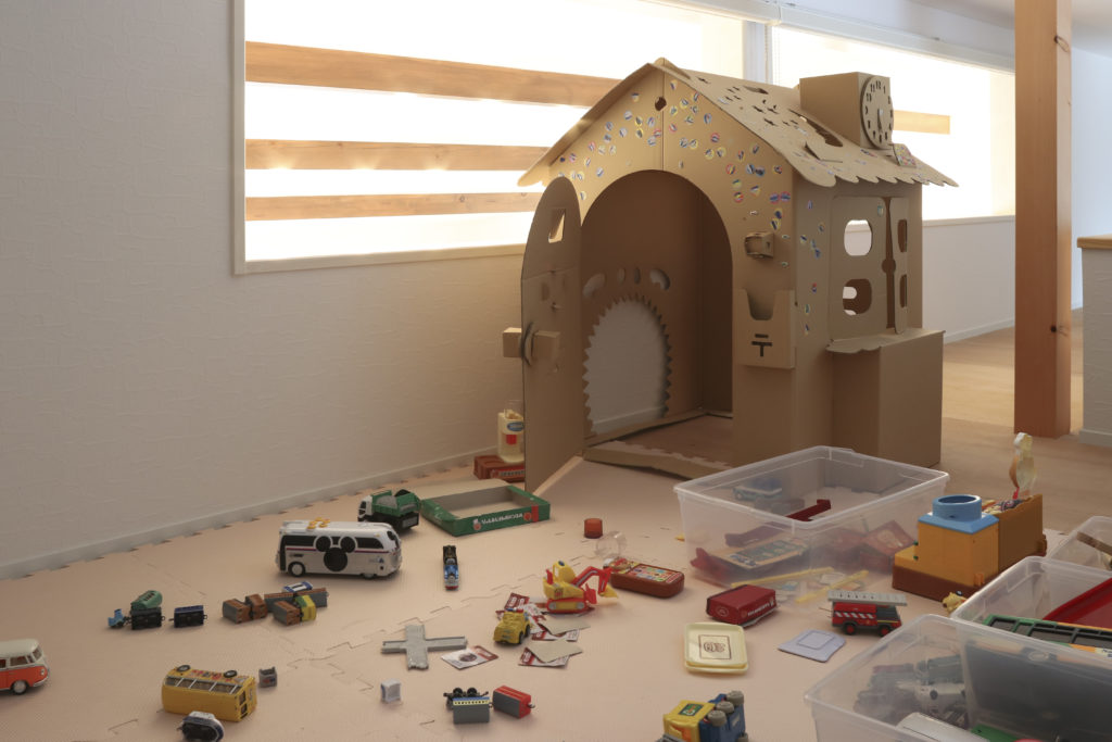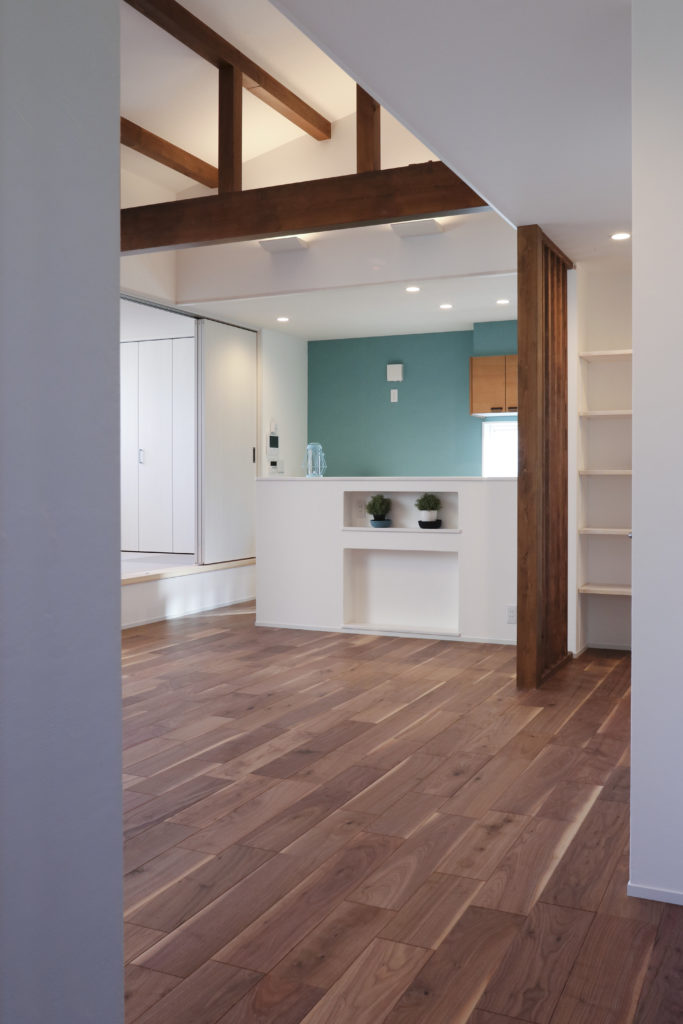 LDK脇の畳コーナーの珪藻土は家族ワークショップで 職人さんの指導の下塗っていきました。材木も岐阜まで見に行き 住宅建築をご家族で楽しんでいただいたのではと思っています。