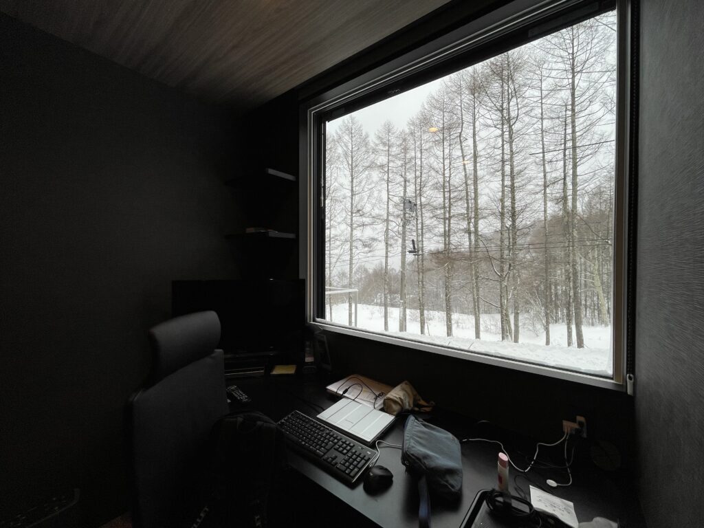 スキーリゾートの別荘地でのお建替えです。ビジネスの場が国内国外を超えて、どこでもできるのではないか、自宅ではなく自然の多い場所でチームが仕事をするというとても新しい場の整え方でした。